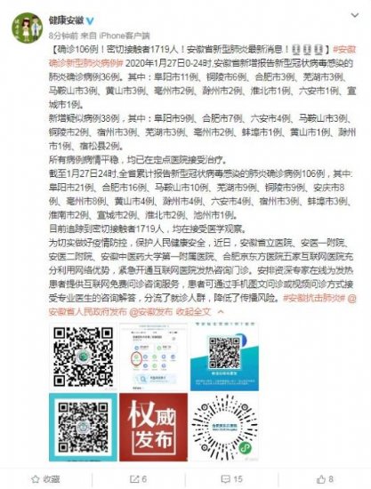 截至1月27日24时,全省累计报告新型冠状病毒感染的肺炎确诊病例106例,其中:阜阳市21例、合肥市16例、马鞍山市10例、芜湖市9例、铜陵市9例、安庆市8例、亳州市8例、黄山市4例、滁州市4例、六安市4例、宿州市3例、蚌埠市3例、淮南市2例、宣城市2例、淮北市2例、池州市1例。
