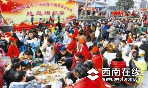 挂起红红的灯笼,跳起欢快的舞蹈,整起热闹的九大碗。1月21日下午,天全县城厢镇黄铜西城社区的7000余名群众,自发组织起感恩坝坝宴,喜庆搬新家、迎新年。