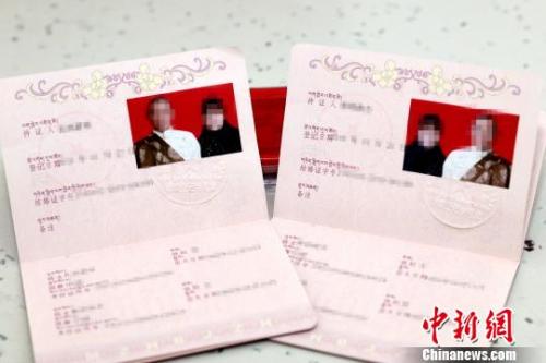 二人在工作人员的指导下开始认真填写申请结婚登记申明书,填写完毕后,婚姻登记处工作人员将两份结婚证郑重地交到扎某和索某手中。