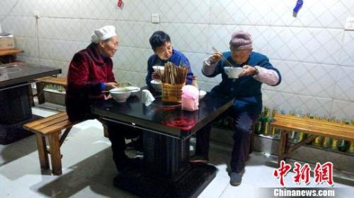 图为三位老人正在免费吃早餐。 瞿宏伦 摄