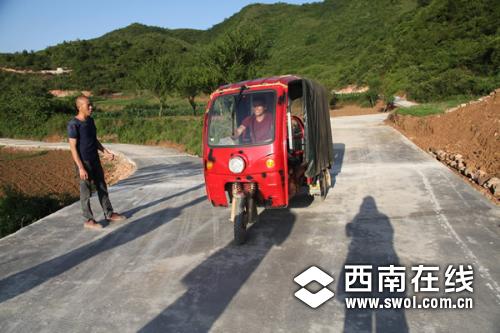张伟与驾着农用车走在新修的机耕道上的村民交谈