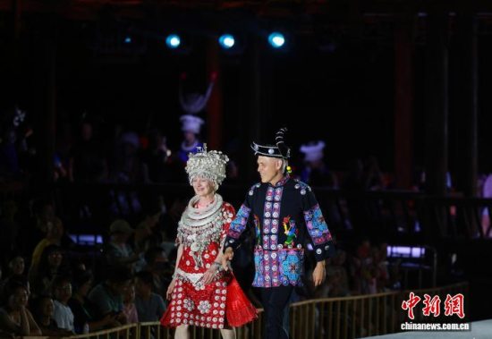 在众多登台者中,年近八旬的苗族老人潘玉珍和邰老二最为引人注目。她们满头银发,却身姿挺拔,身着亲手缝制的苗族传统盛装,从容稳健地走在“T台”上,赢得观众阵阵掌声。